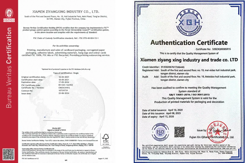 R: temos FSC, FDA, SGS, VOC e conformidade com regulamentações ambientais como RoHS, 94/62/EC e US TPCH. Nossa fábrica possui certificação ISO9001, como fornecedora e exportadora líder internacional de embalagens.